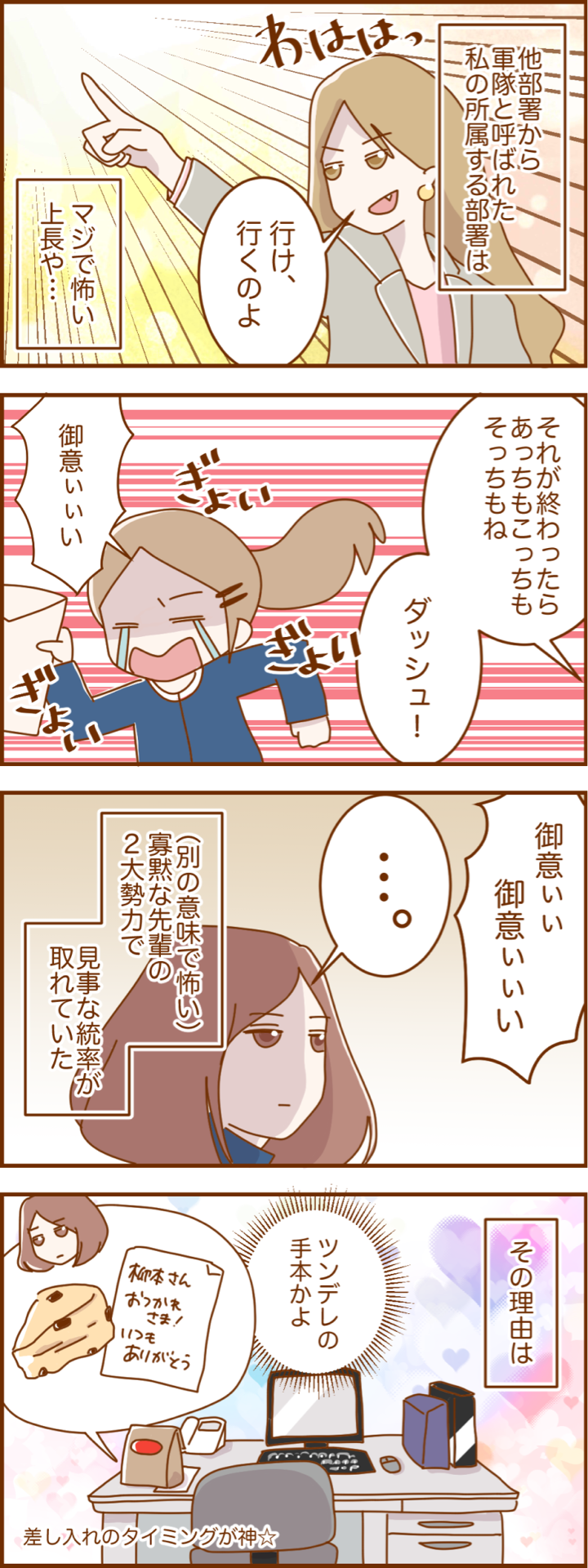 2018年07月14日 031:従順な部下の育て方 アメとムチの使い方が上手すぎる。 普段マジで怖いんです、全員!でも限界ちょい前になると寡黙な先輩から差し入れ(しかもメッセージ付き)がそっとデスクの上に置いてあるんですよね。最終的にこの先輩は、手編みの手袋まで編んでくれたんですよ。手が小さい私はジャストサイズの手袋をはじめて得ました。毎日失敗ばかりしてる超下っぱの私に「いつもありがとう」と言える先輩の心の広さよ。私は後輩にそんなこと1度も言えなかったなぁ。 「第2章:港区の運び屋」カテゴリの最新記事 < 前の記事