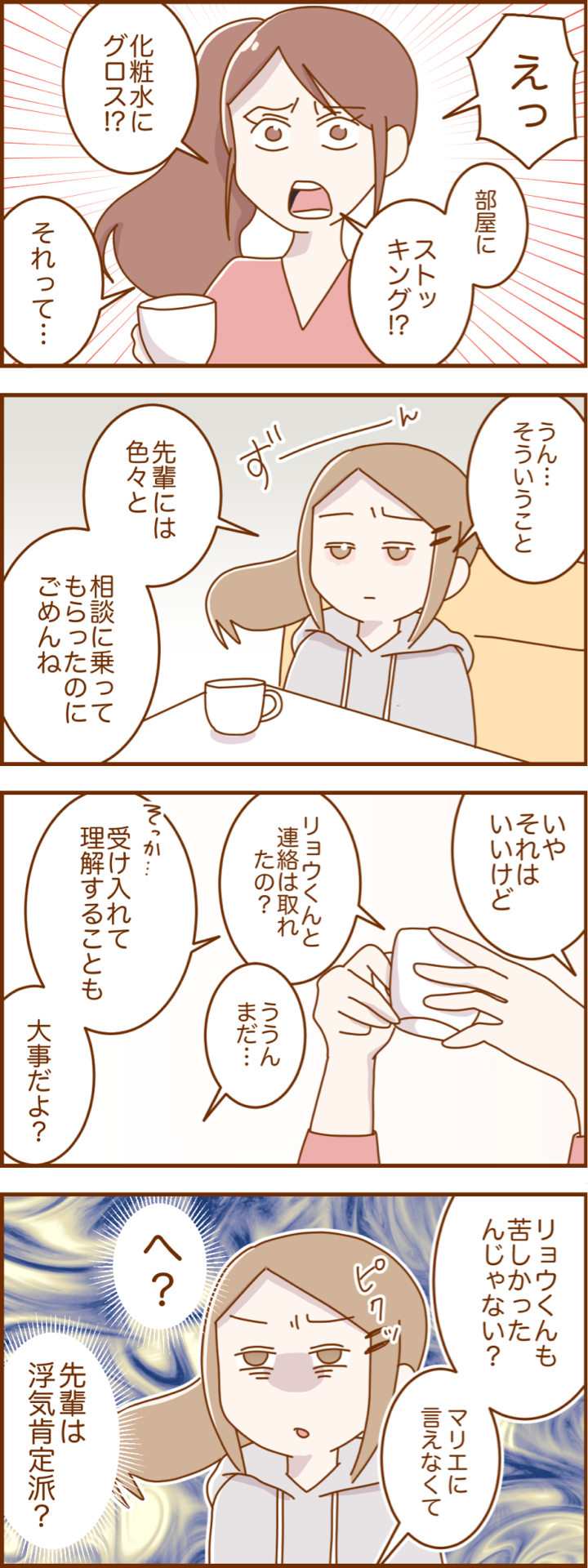 2018年09月11日 061:浮気は本能? まさかアンジャッシュのコントみたいなことが自分の身に起こるとは…!!!最初からまったく噛み合っていなかったらしくて、さすがに笑いました。 現場(部屋)を見た私としては「女装」という発想はなく「浮気」一択だったのですが、第三者の視点だとほかの選択肢も見えてくるものなのでしょうか。 「第3章:OLの極み」カテゴリの最新記事 < 前の記事